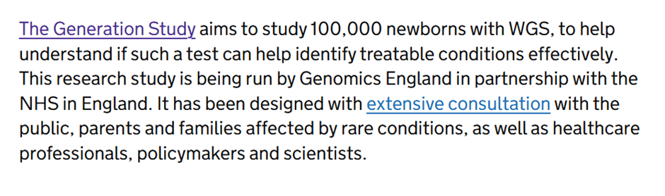On its website, Genomics England has a page titled ‘Newborn Genomes Programme: Designing the NHS-embedded Generation Study’. Although the UK government’s blog provides a link to this page twice (see the words “The Genome Study” and “Genomics England’s website” in the images below), there are no details available.